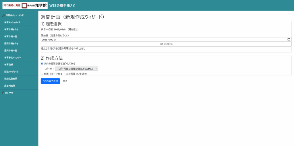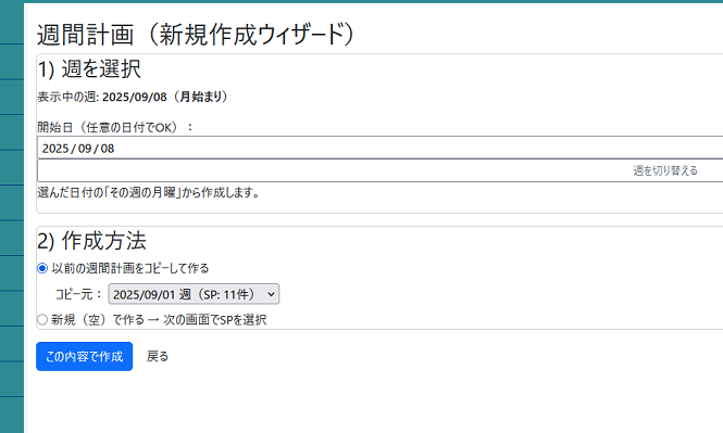 次に週間計画の作成方法です。初回はコピーするものがありませんから、新規でつくるにチェックをいれてこの内容で作成を押してください。