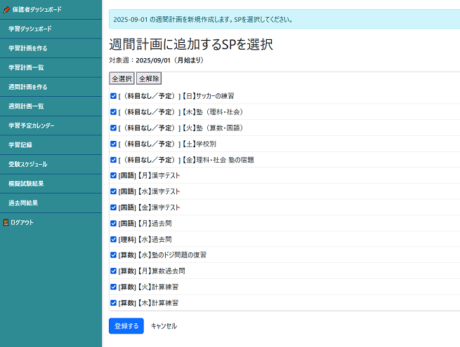 学習計画でつくった内容がそのまま提示されています。すでに全選択されていますが、入れないと思うものがあれば、チェックを外してください。その上で「登録する」ボタンを押してください。